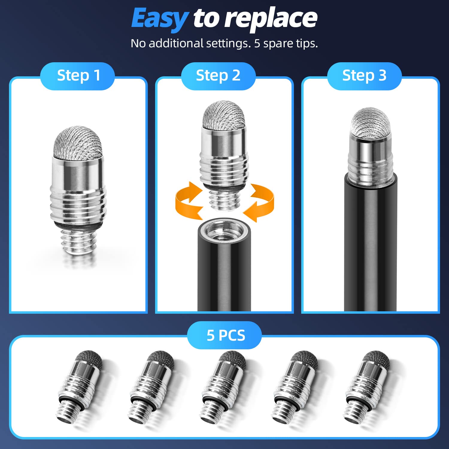 [Extra 5 mesh tips] Equipped with 5 extra spare nibs, when the original nib is accidentally damaged, you only need to gently rotate the stylus nib to complete the replacement. The hook on the stylus can also make it easier for you to store it in your pocket or on a book.