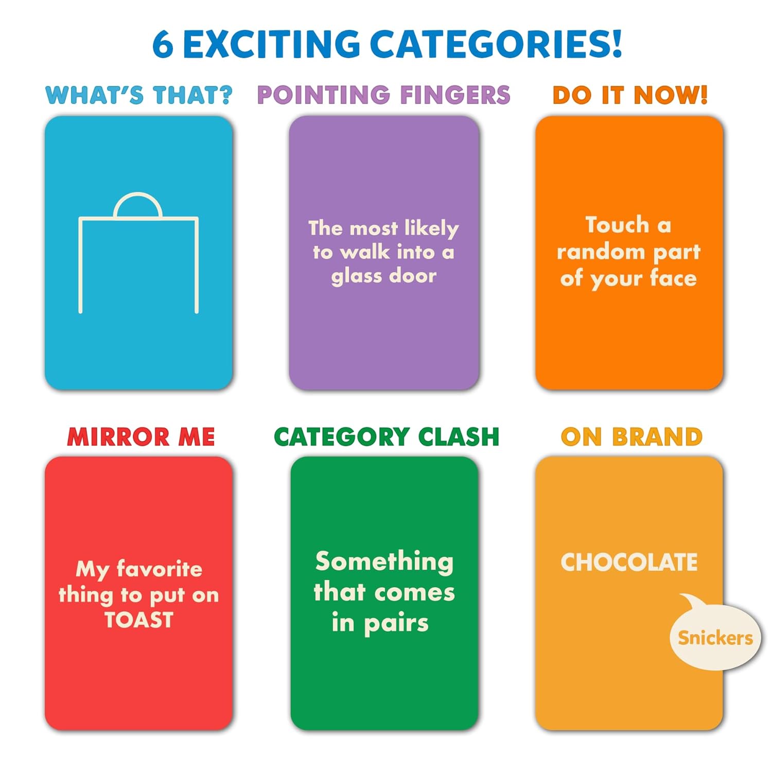 6 EXCITING CATEGORIES: With 6 different categories, What’s That, Pointing Fingers, Do It Now, Mirror Me, Category Clash, and On Brand – each round brings a fresh and unpredictable challenge. Match your partner’s answer or move to stay safe; miss the mark, and you risk flipping a letter!