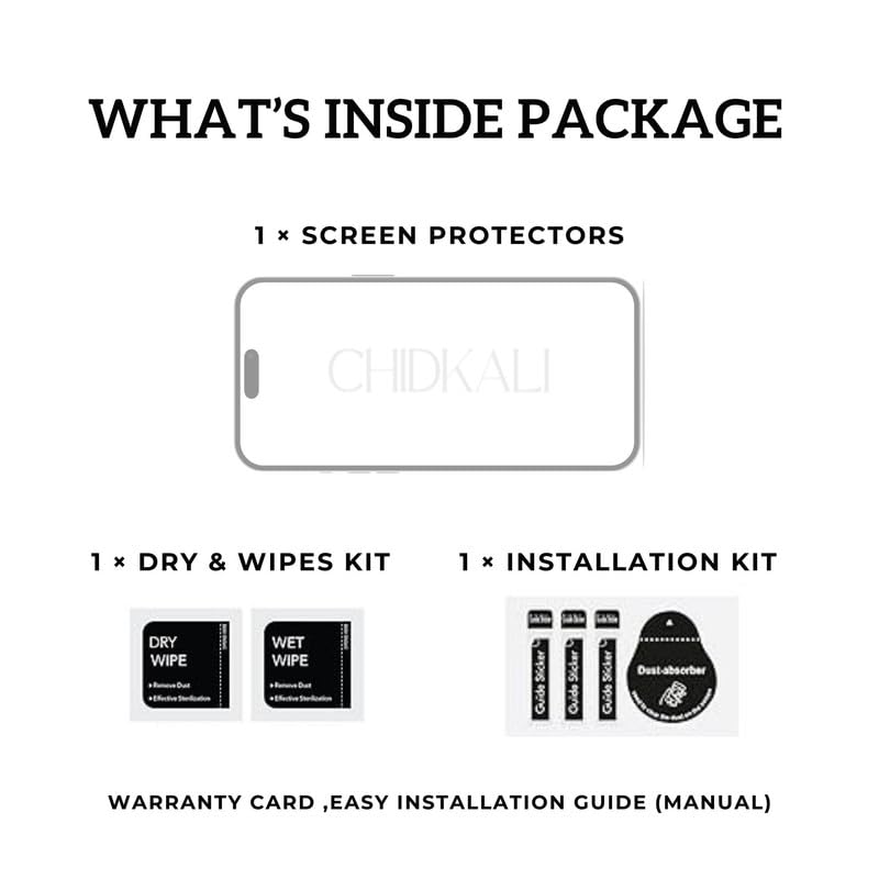 Included Components: Crystal Tempered Glass Guard, Wet Wipe, Microfiber Screen Cleaning Cloth, Dust Absorber Sticker and Firsttrend Essentials Box With Installation Guidelines, Warrenty Card.