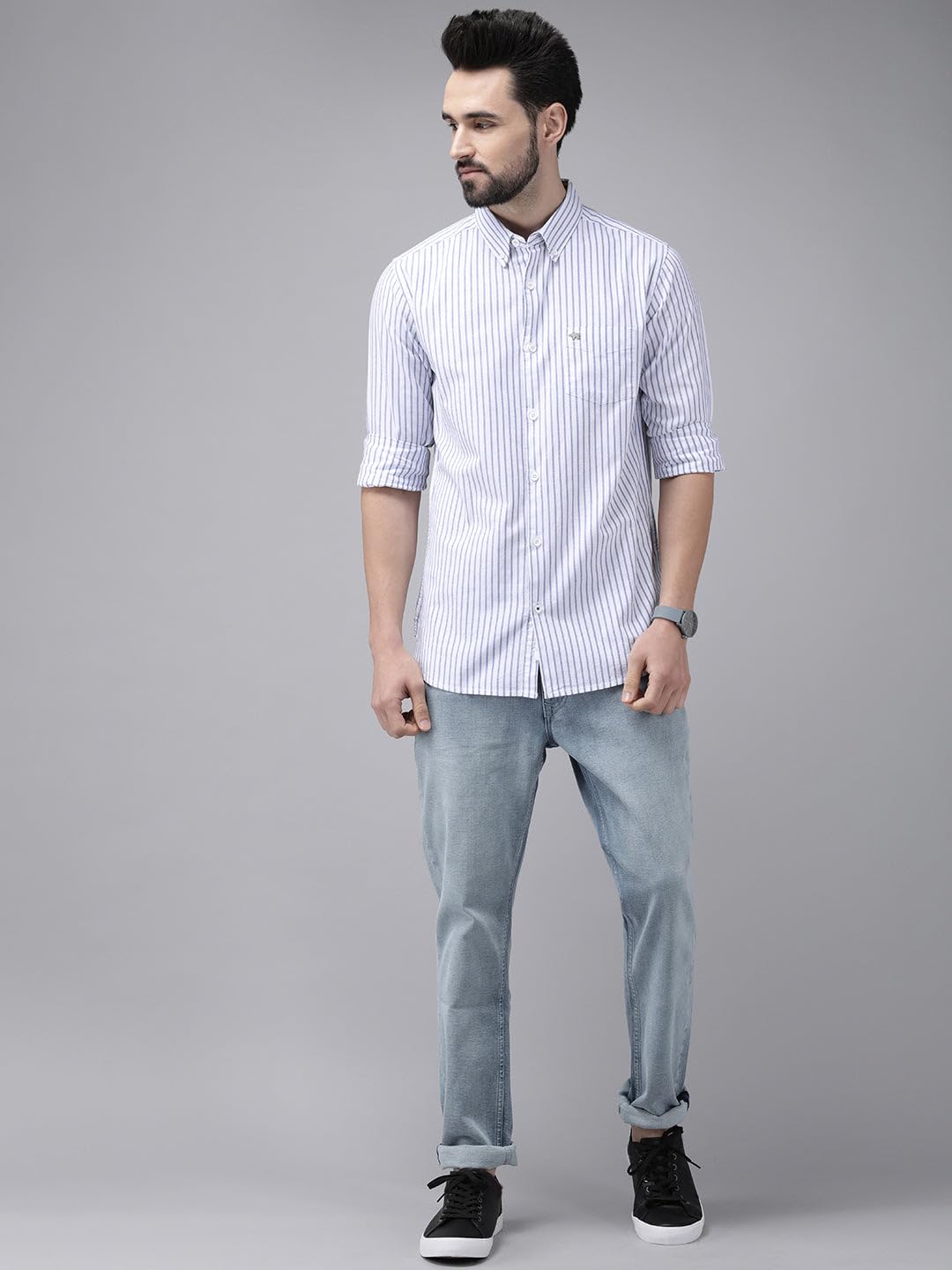 Manufacturer : BEAR HOUSE CLOTHING PVT LTD, THE BEAR HOUSE Men’s’s Striped Button-Down Casual Shirt | White | TBH-SHOMI-WH