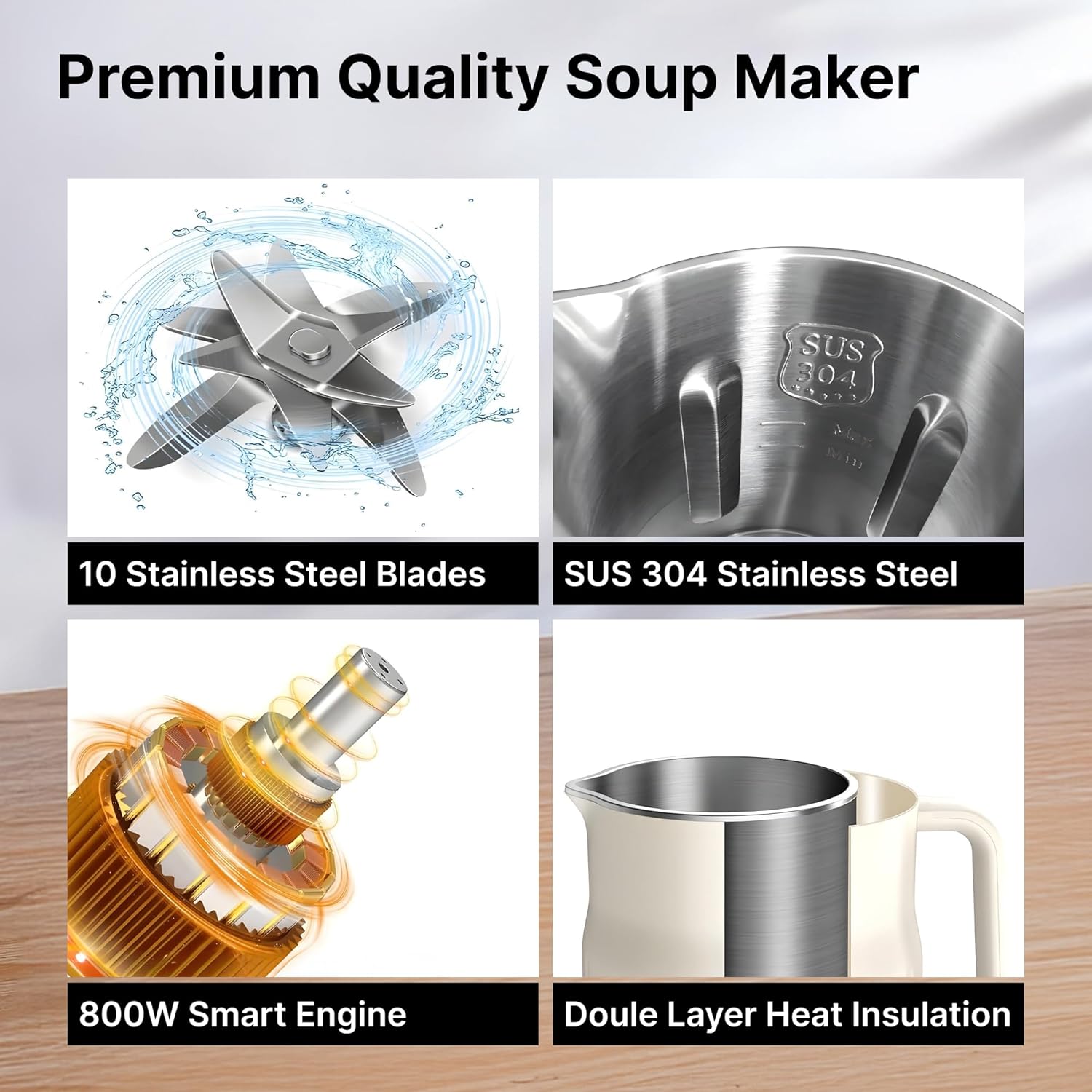 STAINLESS STEEL INNER & BLADES- This Soup Maker features a robust stainless steel inner body and blades, ensuring durability, rust resistance, and food safety.