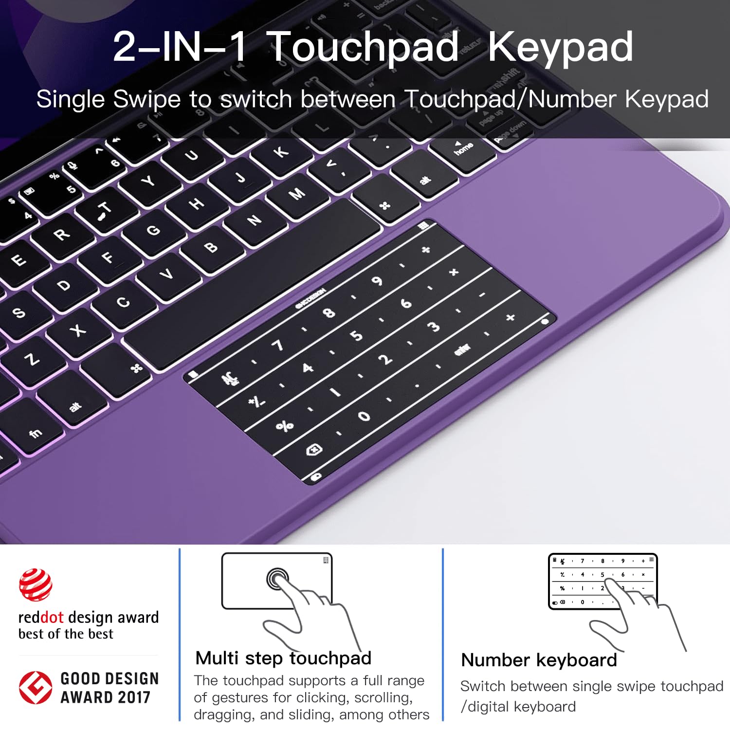 【Innovative Transformation】2-IN-1 Touchpad with Numeric Keypad The idea of 2-in-1 touchpad is that make the touchpad with numeric keypad. You can easily switch the touchpad /number keypad to multi-touch trackpad mode or number keypad mode freely.