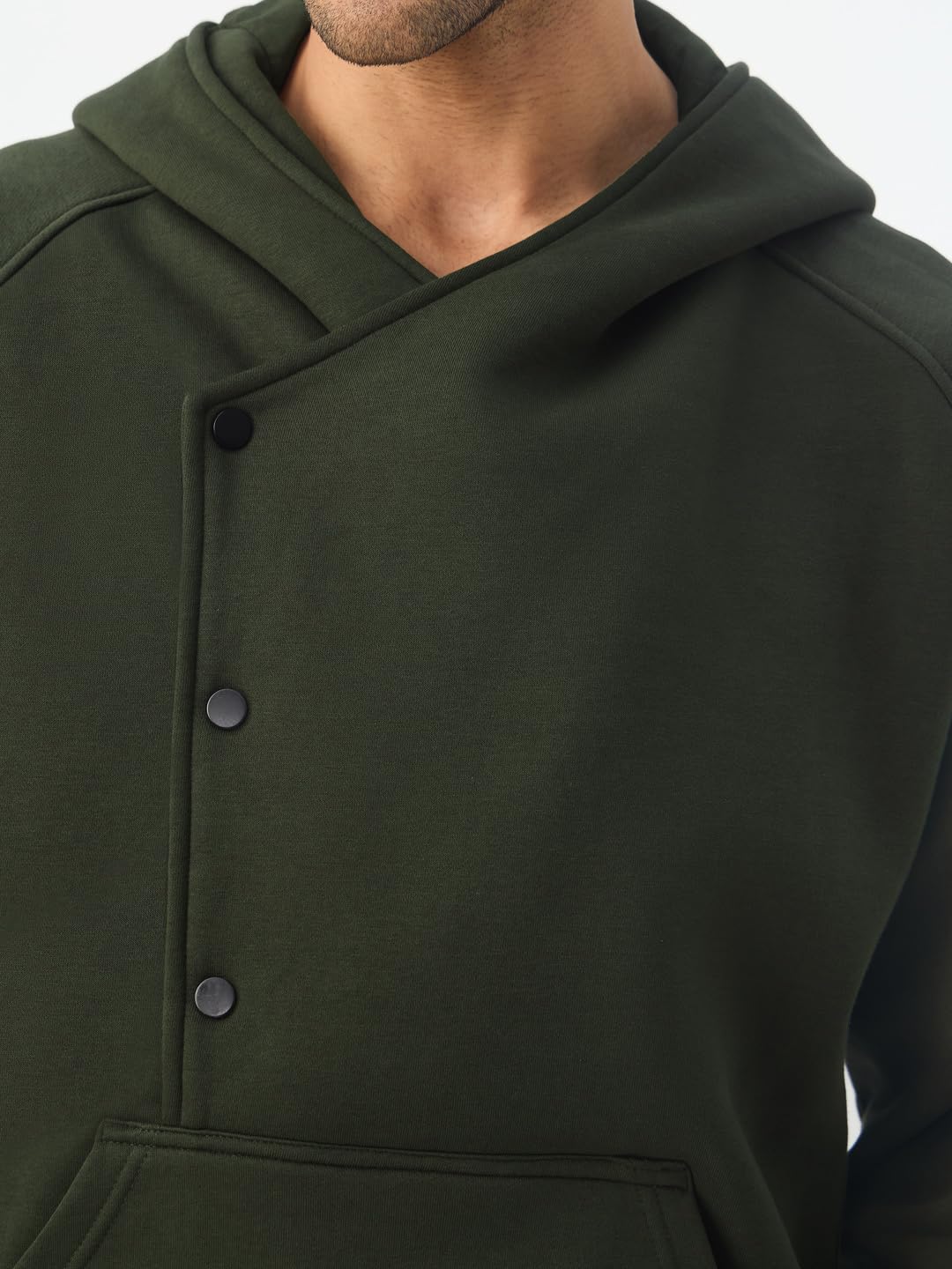 Embrace empowerment through comfort and style with this essential olive terrain hoodie, designed for those who value a minimalist aesthetic and maximum impact. The Souled Store delivers premium streetwear that blends high-quality construction with everyday wearability. Crafted from a premium heavy fleece cotton polyester hoodie blend, this piece offers unparalleled softness, making it the perfect warm hoodie for men during colder months. The oversized hoodie men’s fit and drop-shoulder sleeves create a relaxed silhouette, while the unique asymmetric button placket and kangaroo pocket hoodie design add modern, practical touches for your casual winter wear.