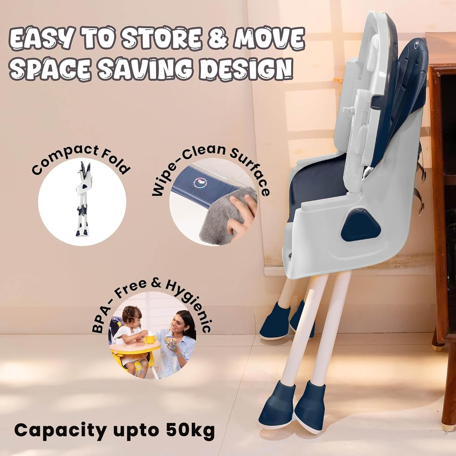 WASHABLE & HYGIENIC DESIGN:- Featuring a removable, double tray system and washable PU seat cushions, ensuring easy cleanup and maintenance, even after messy meals.
