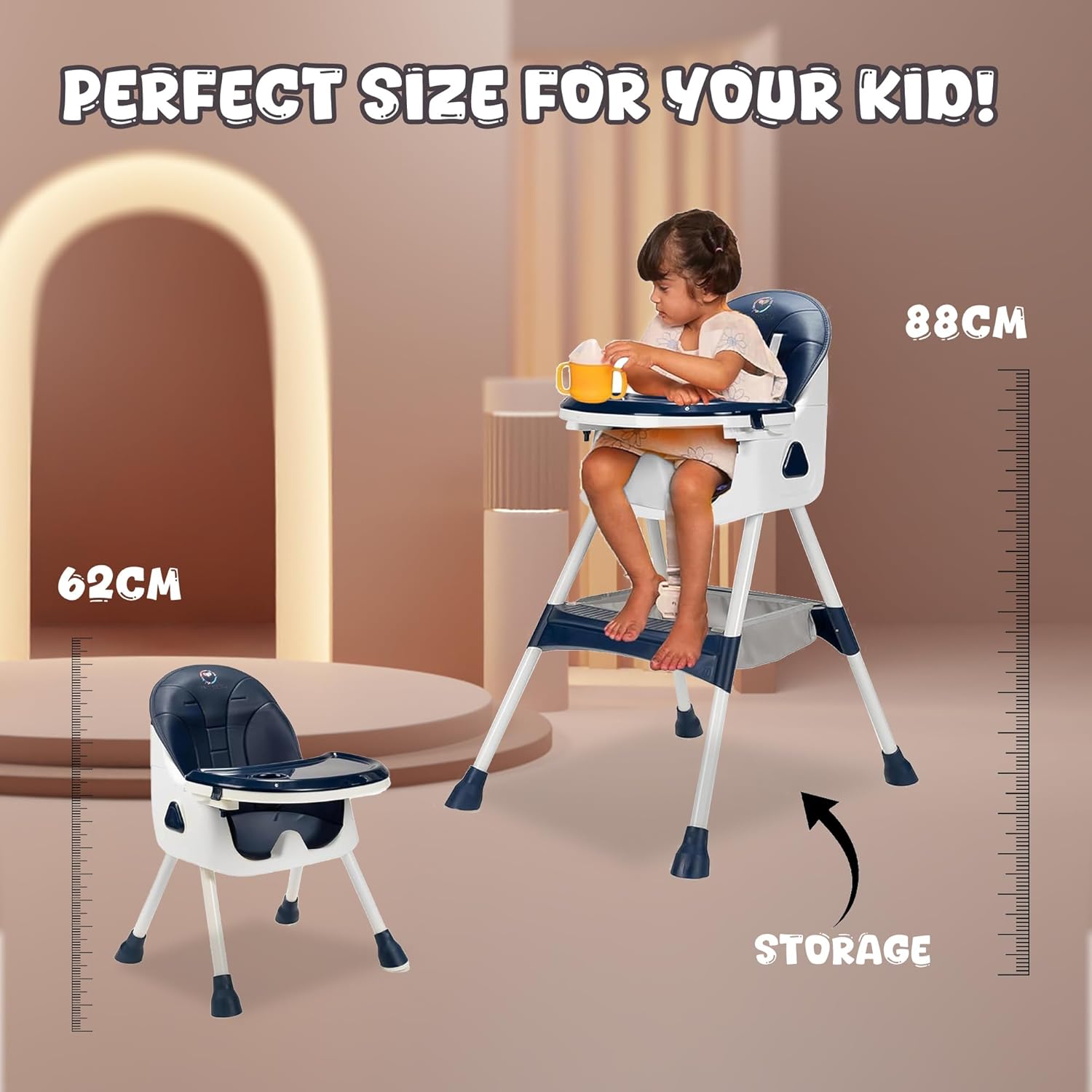 HEIGHT ADJUSTMENT:- Customizable comfort with adjustable seat heights, ensuring your baby’s comfort during meals and naps.