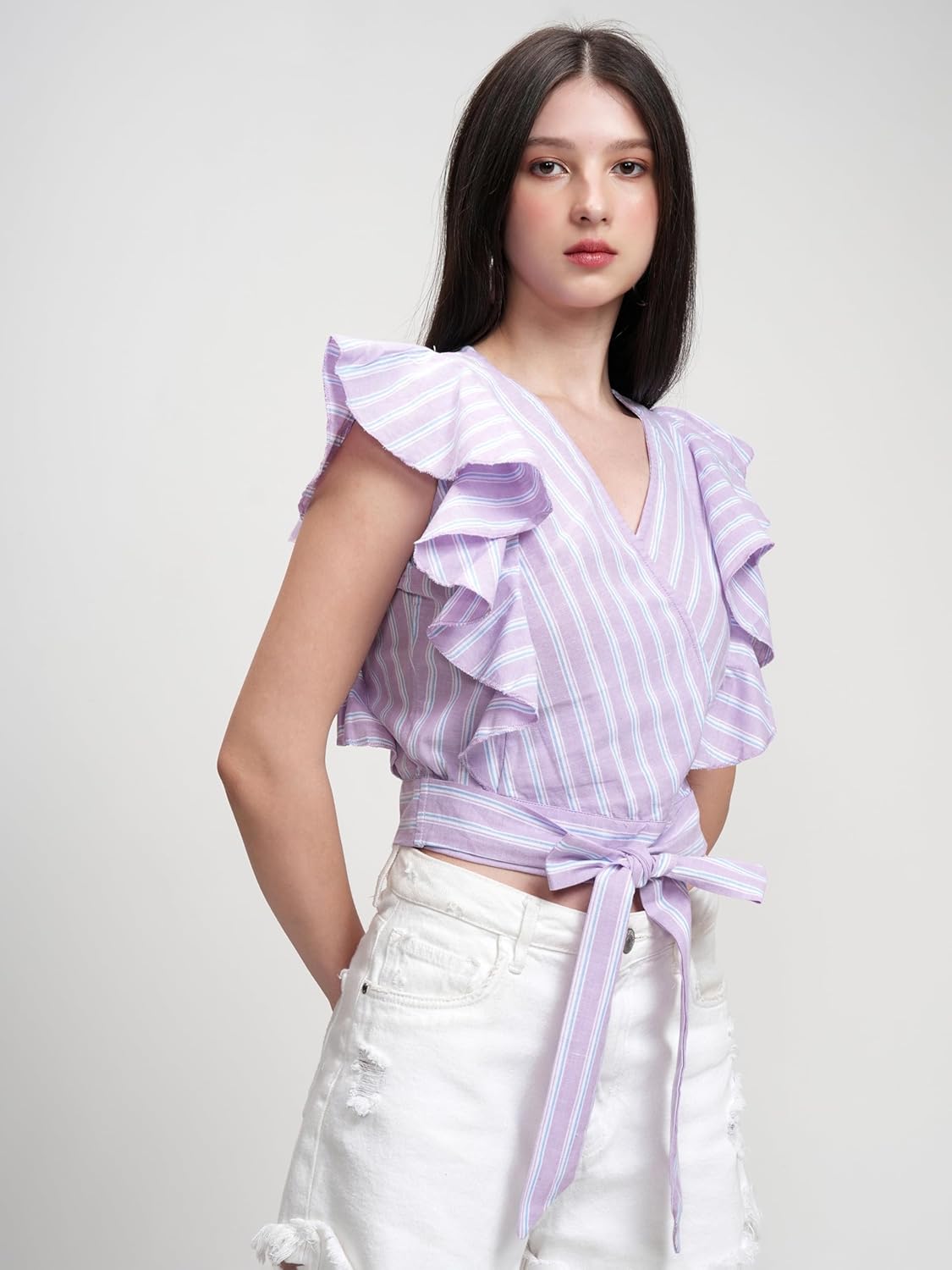 Tokyo Talkies Striped Cinched Waist Tie-Up Belt Crop Top With Ruffle | Chic & Flirty | Perfect For Casual & Summer Days | Tops For Woman | Women Tops