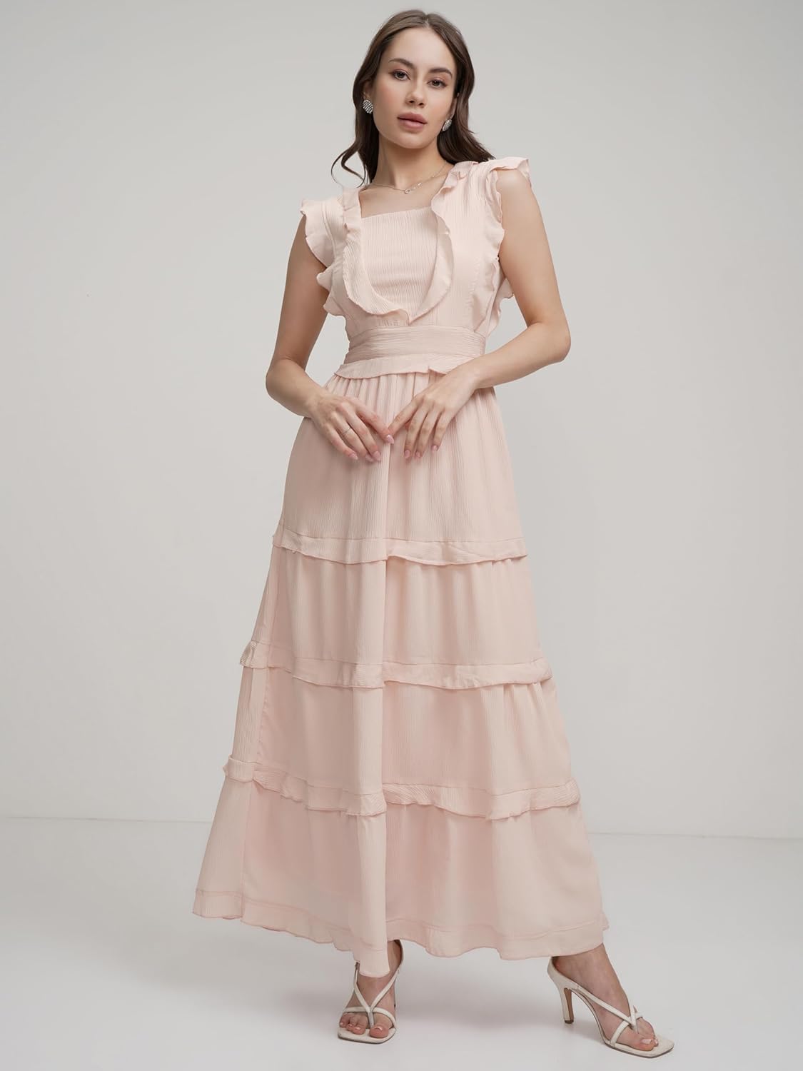 Tokyo Talkies Womens Elegant Flutter Sleeve Tiered Maxi Dress | Flowy & Feminine Silhouette for Effortless Grace | Dress for Women | Women Dress | Stylish Women Dress