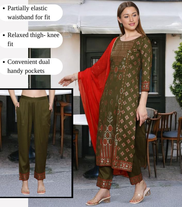 Elevate your ethnic style with this A-line Set, crafted from 100% viscose rayon for the kurta and pant, paired with a pure chiffon printed dupatta. The breathable, soft, and moisture-wicking fabric ensures all-day comfort, while the artistic foil print and intricate lace work add festive charm. Featuring a secured dual side pockets and partially elasticated pant, it’s both functional and flattering. Perfect for daily wear, office, party, wedding, haldi, or festive occasions, this elegant kurti suit set for women blends traditional grace with modern sophistication — a stylish ethnic outfit for every woman. Pair it with minimal jewelry for office wear or statement earrings and juttis for grand occasions.
