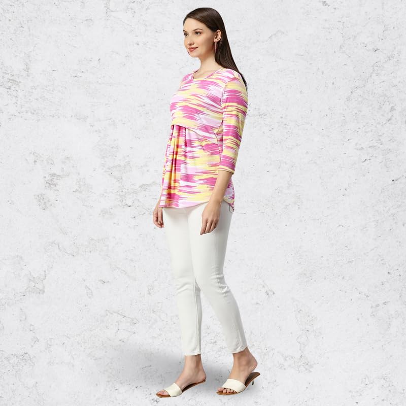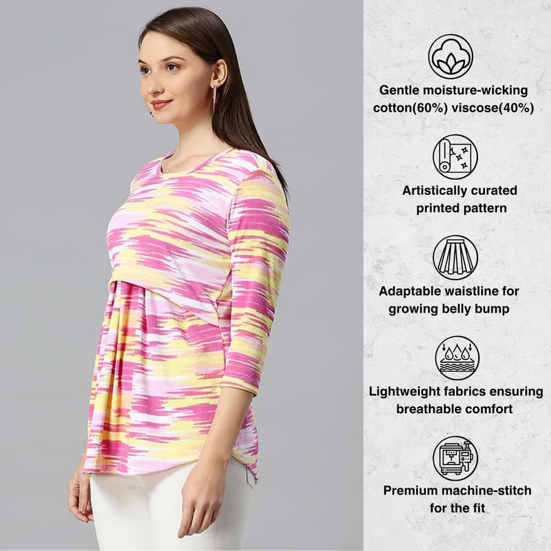 Step into effortless elegance with this zipless maternity tunic top from True Shape, designed for comfort and style throughout motherhood. Made from soft, breathable knitted hosiery, it features a pleated silhouette that adapts to your growing bump. The dual-coverage nursing access offers wide, zip-free openings for easy pumping and discreet feeding. Its artistic abstract print adds flair to your everyday wardrobe. Perfect for daily wear, casual outings, baby showers, or gifting, this pre- and post-pregnancy essential blends thoughtful design with functionality—making motherhood beautifully comfortable and confidently chic.