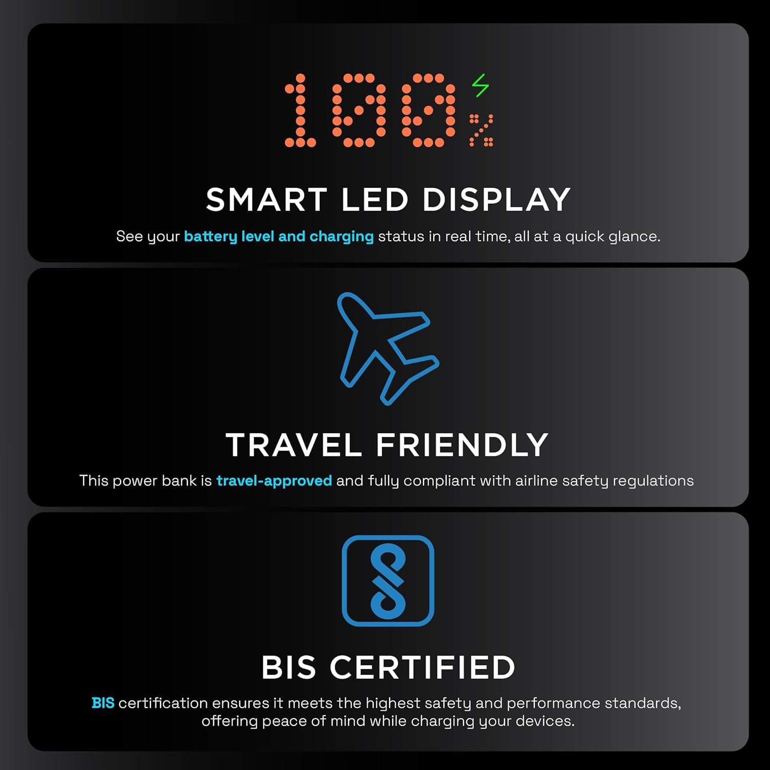 🔌 Built-In Detachable Type-C Cable + Dual Ports – Charge anywhere without carrying extra cables. Features a detachable Type-C cable with Type-C input/output dual port for flexible wired charging.