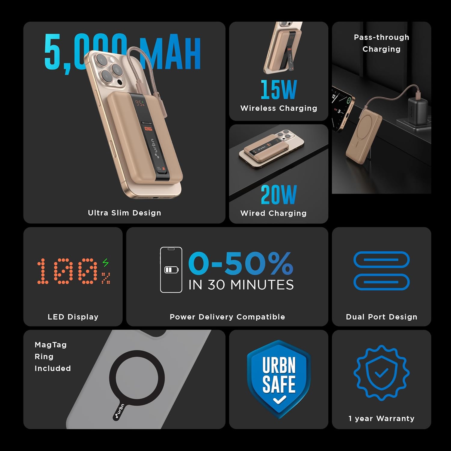 Strong Magnetic Hold: Keep your devices secure and in place with the powerful magnetic hold of the URBN Magsafe Power Bank, while also enjoying the freedom of wireless charging. The included MagTag Ring keeps your power bank securely attached to your phone, ensuring you never run out of battery on the go.