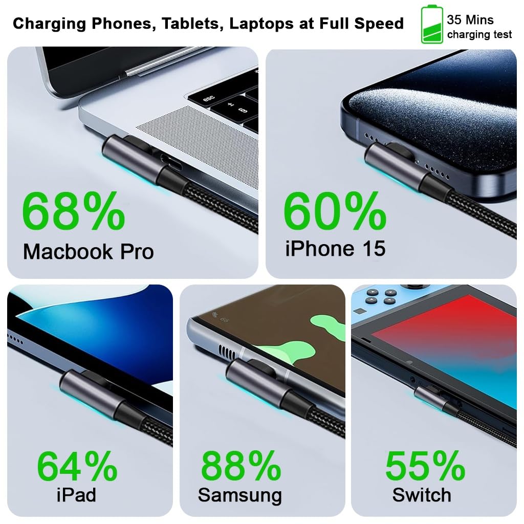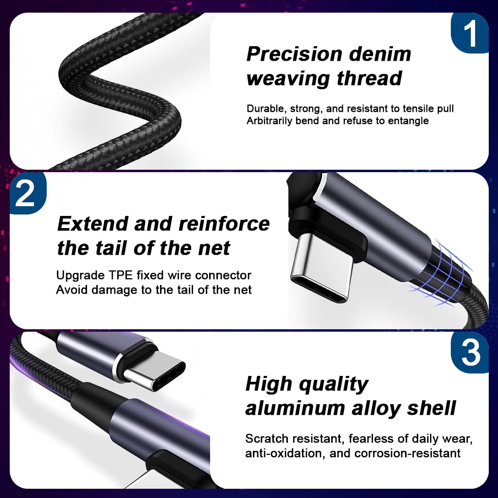 90° RIGHT ANGLE TYPE C CABLE: The innovative right-angle plug design ensures a comfortable and secure fit, minimizing bending and stress near the connector. This type c to c cable considerate design feature is ideal for gaming, video streaming, or charging in tight spaces, helping to prolong cable life and protect device ports from unnecessary wear