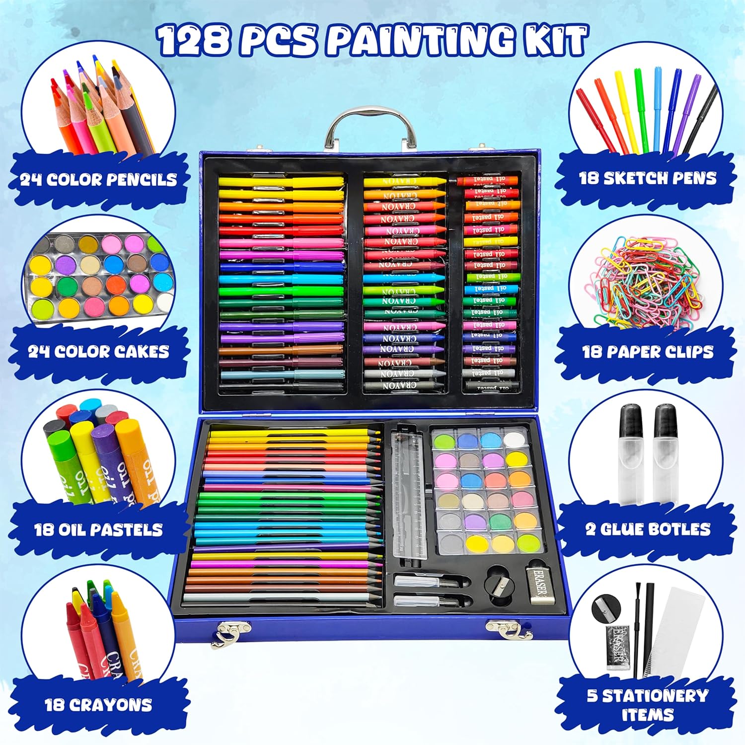 • 128-piece art kit with all painting essentials included.