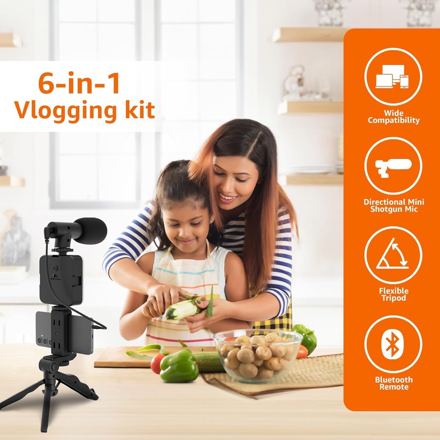 Vlogging Kit 6 in 1 for iPhone, Android (with Tripod), Mini LED + Cardioid Microphone + Phone Clip + Tripod for Live Broadcasting, Video Calling, Vlogging, YouTube, Instagram (T-6.1)