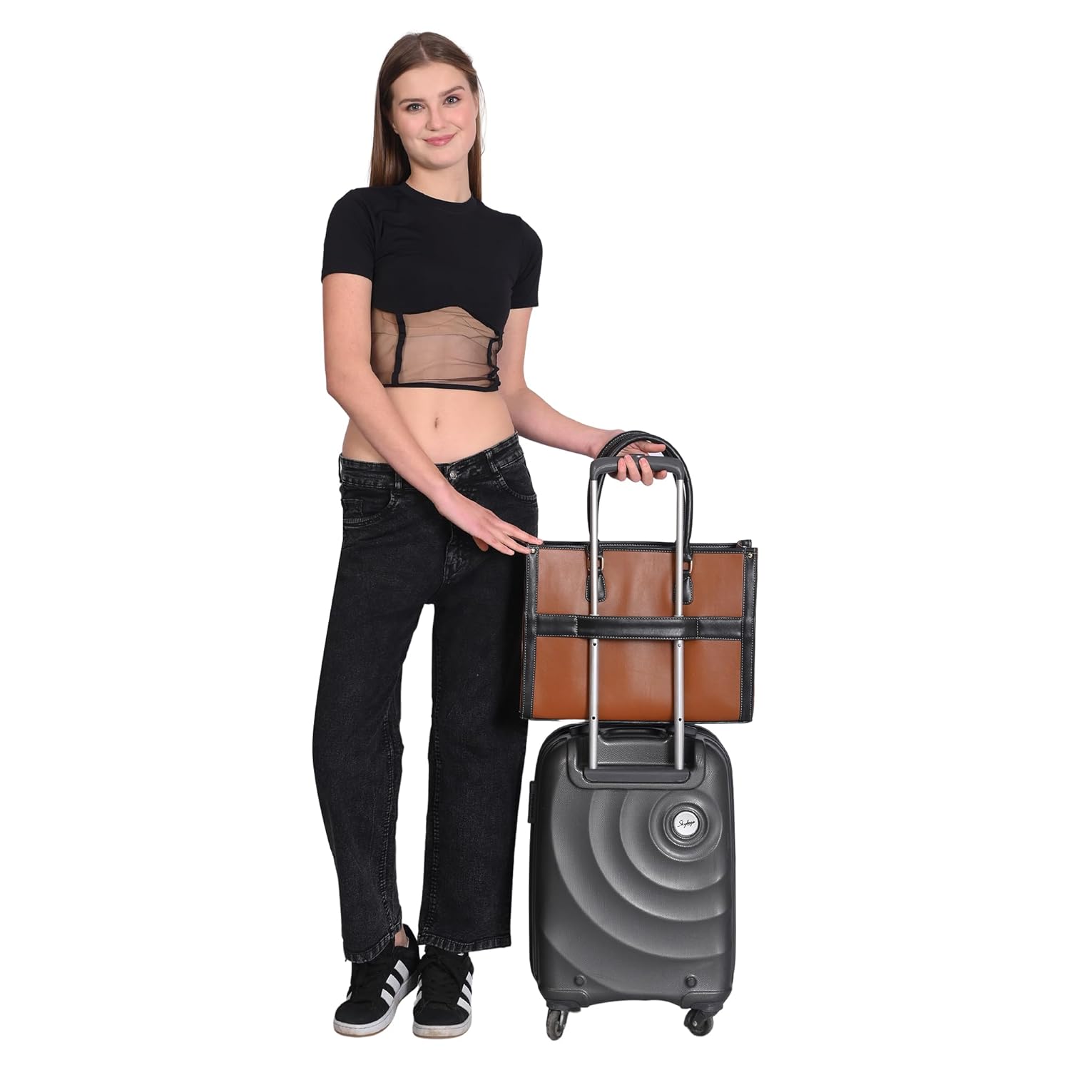 Elevate your professional style with this sophisticated Womanix handbag featuring a striking two-tone design in black and tan. The spacious main compartment is perfect for carrying your daily essentials, while the premium synthetic leather construction offers both durability and elegance. The bag showcases meticulous contrast stitching, polished gold-tone hardware, and a sleek brand plate. Its versatile design includes both top handles and an adjustable shoulder strap for multiple carrying options. The structured silhouette maintains its shape beautifully, making it an ideal choice for work, business meetings, or formal occasions. The classic colour combination ensures this bag coordinates effortlessly with various outfits, while its generous dimensions accommodate laptops, documents, and personal items with ease. The secure top closure keeps your belongings safe, and the thoughtfully designed interior helps you stay organised throughout your day.
