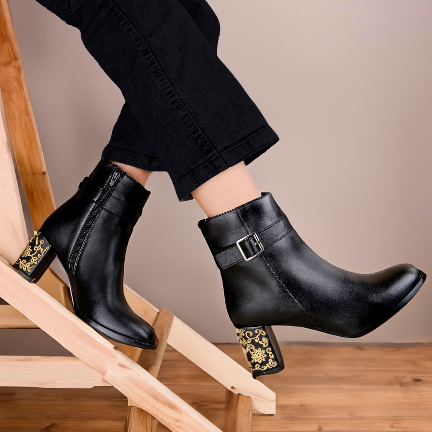 Women’s Faux Leather Material Embroidered Heels Buckle and Zipper High Ankle Formal Boots.