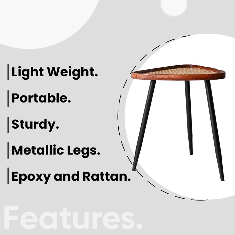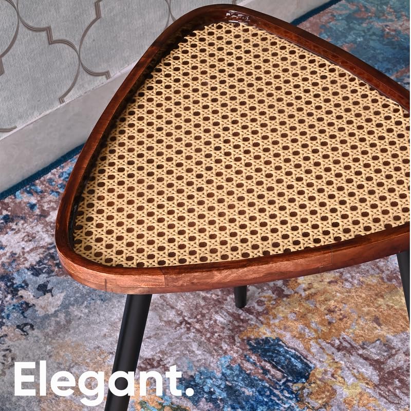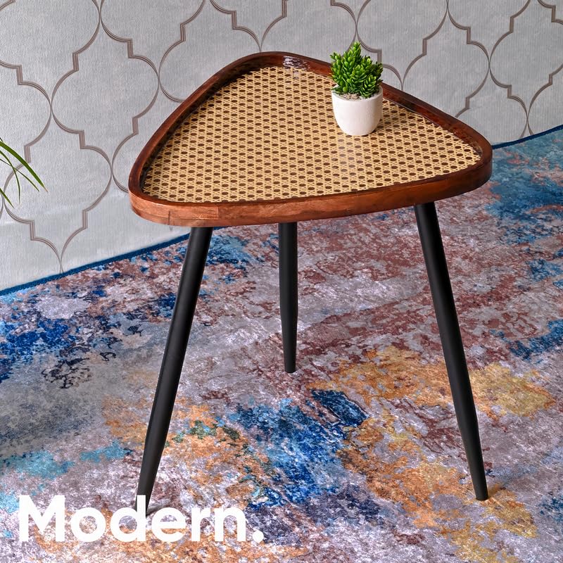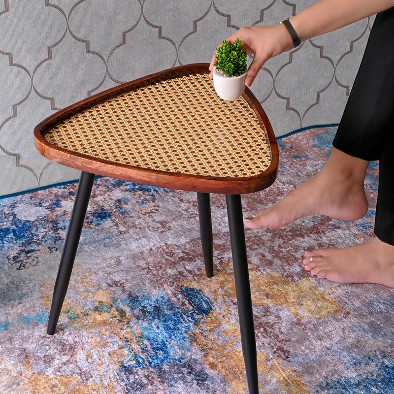 Wooden Side Table for Living Room Decor — 20 Inch Triangular Rattan Table | Mango Wood with Resin/Epoxy & Metal Legs | Coffee/Dining/End Table – Easy Assembly (Walnut & Black)